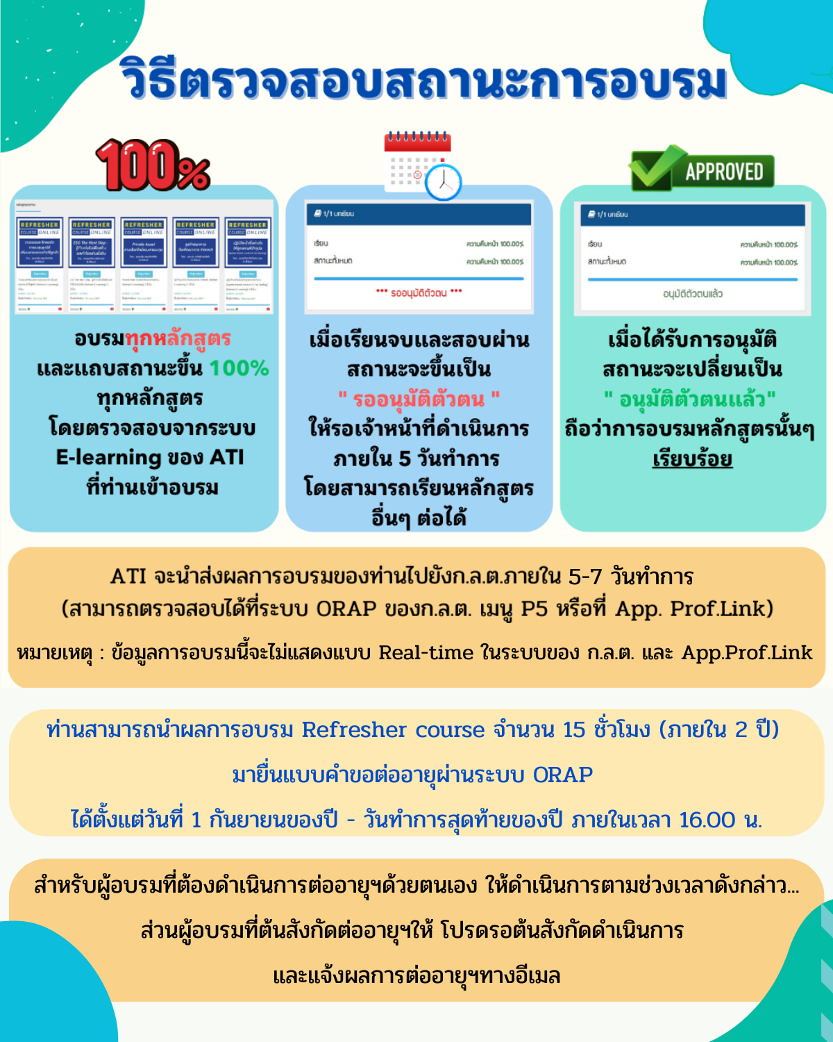 - ATI ส่งผลการอบรมที่อนุมัติแล้วไปยัง ก.ล.ต. หลังจากอนุมัติ ภายใน 5-7 วันทำการ สามารถตรวจสอบได้ที่ระบบ ORAP ของ ก.ล.ต. https://market.sec.or.th/ORAP/Authen/PersonalLogin.aspx
